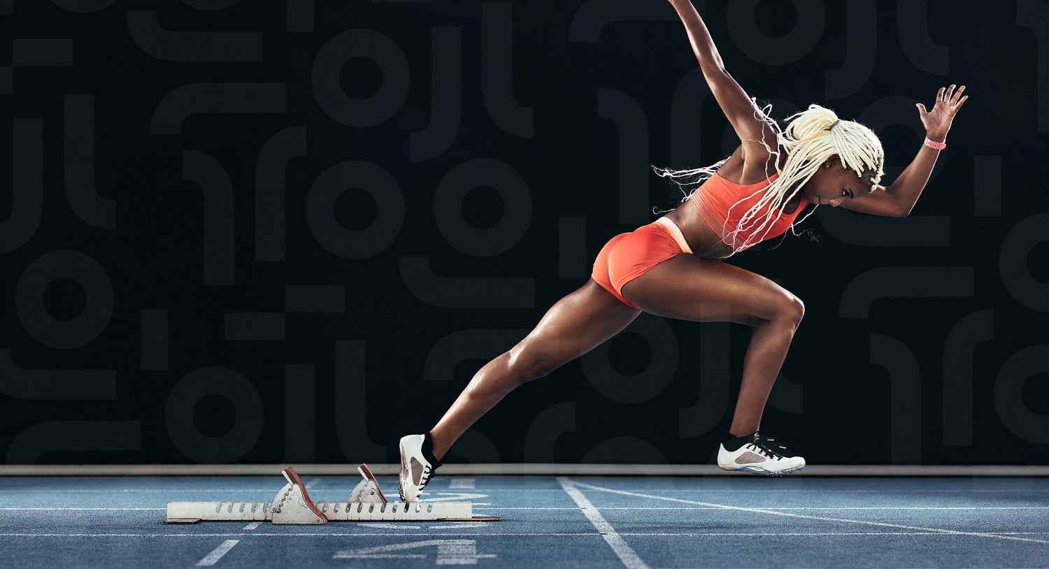 Side view of a female athlete starting her sprint on an all-weather running track on a black background. Runner using starting block to start her run on a running track.