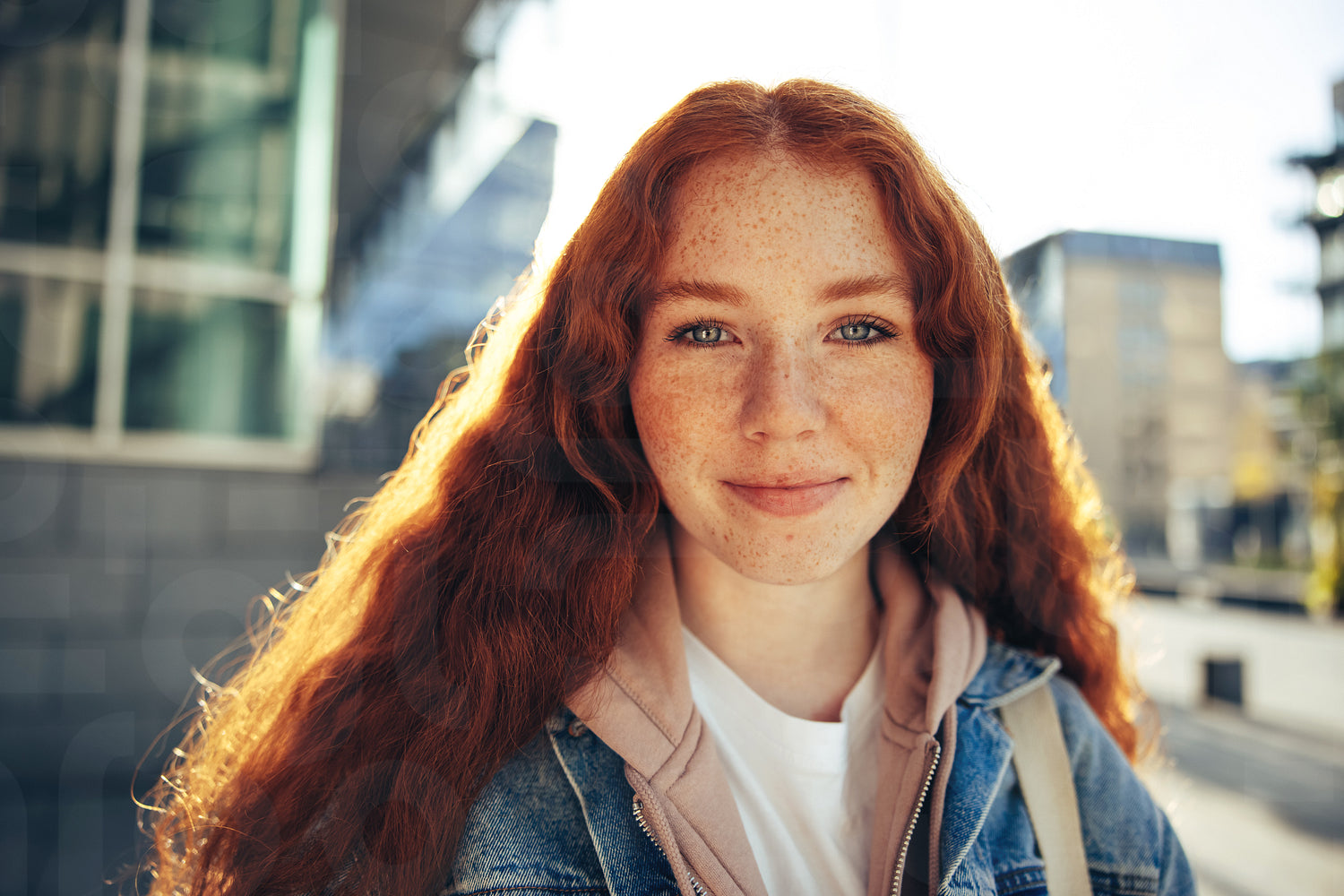 Portrait of young woman in casual wears and red dyed hair outdoors. Female student standing outside looking at camera.
