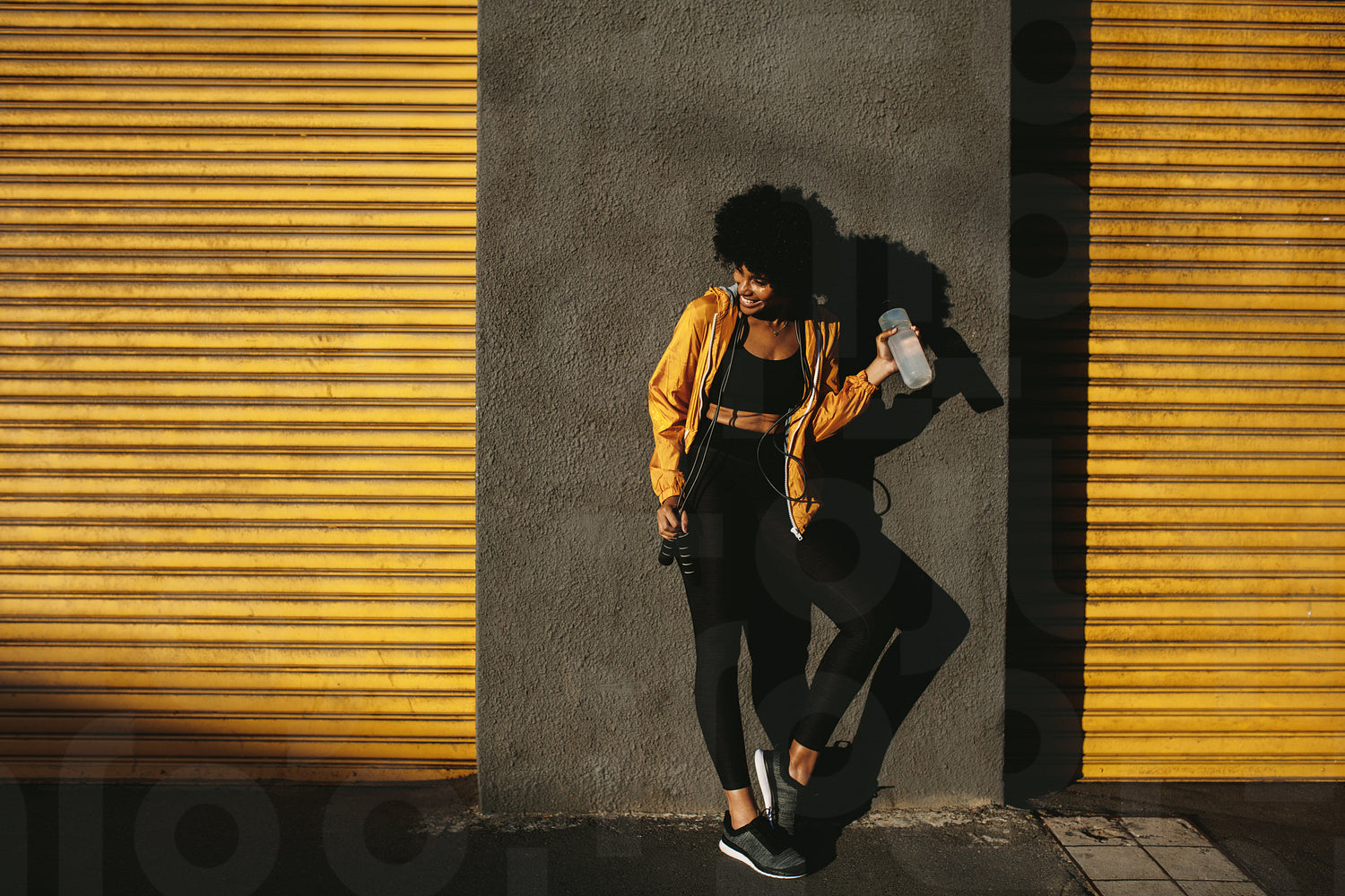 Happy young woman with water bottle standing. Healthy young female taking a break after exercising.