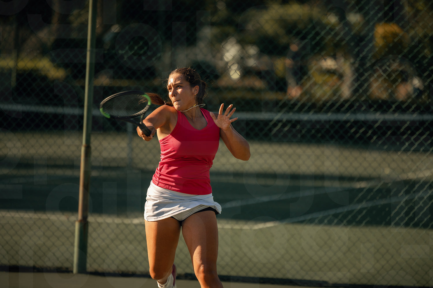 A female tennis player competes intensely on an outdoor court, showcasing athletic skills under the bright sun.