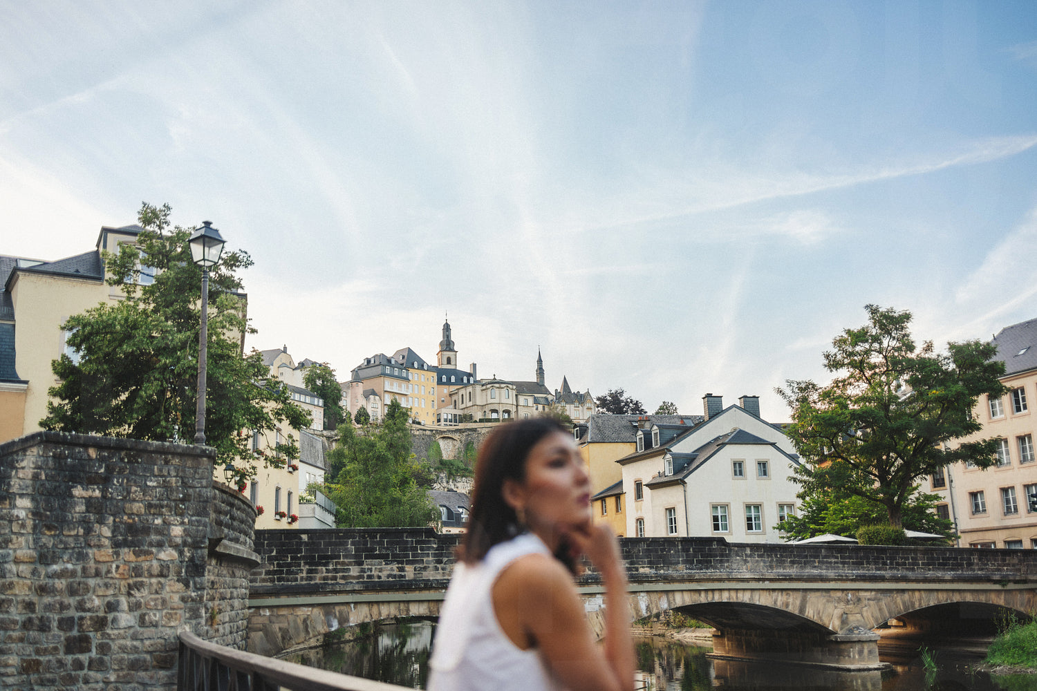 Female tourist looking at the view while standing on a bridge in Luxembourg Old Town. Woman sightseeing in a beautiful city. This photo has intentional use of 35mm film grain.