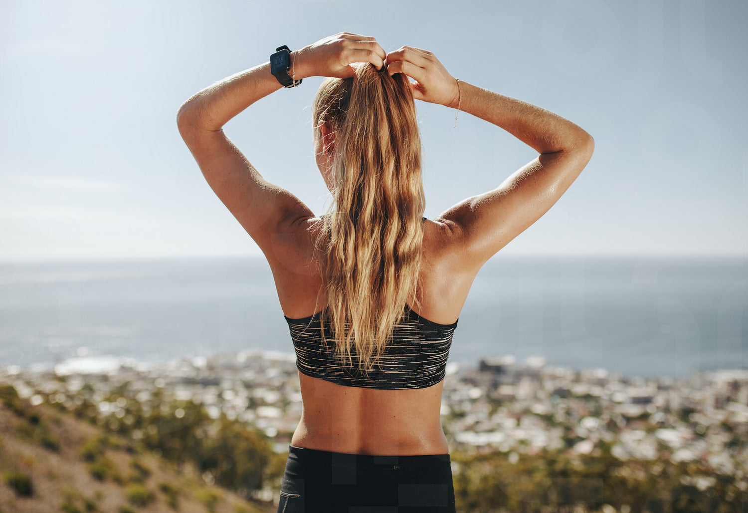 Rear view of fit young woman standing on mountain trail and tying her hair. Female runner in sportswear on cross country path taking break after a run.