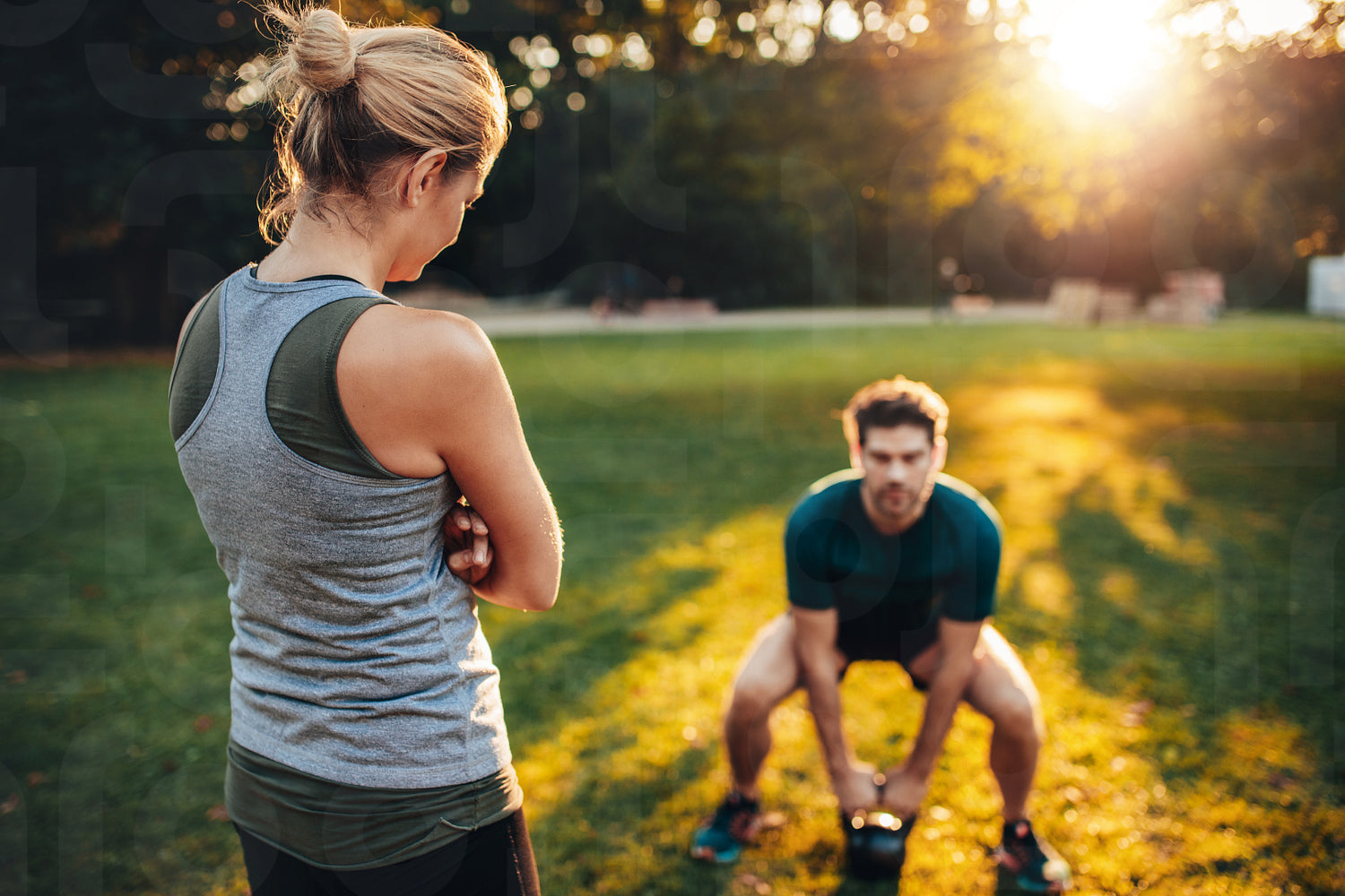Female trainer standing in the park with young man doing weight training with kettlebell in background.