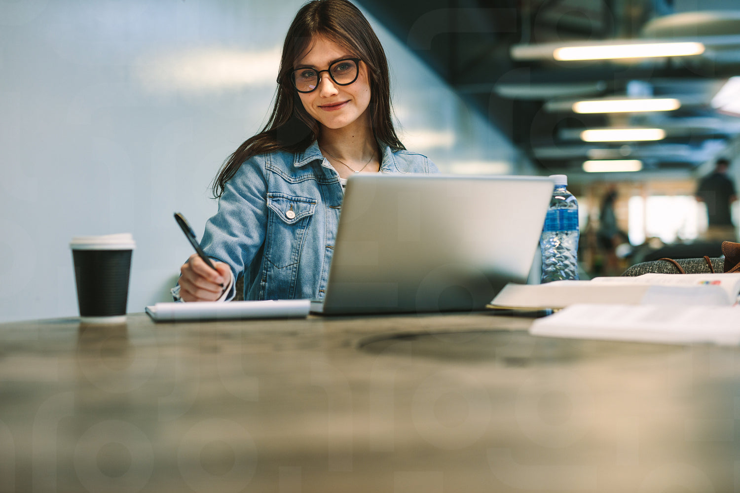 Portrait of beautiful young woman sitting at college library with laptop and notepad. Female university student studying college campus.
