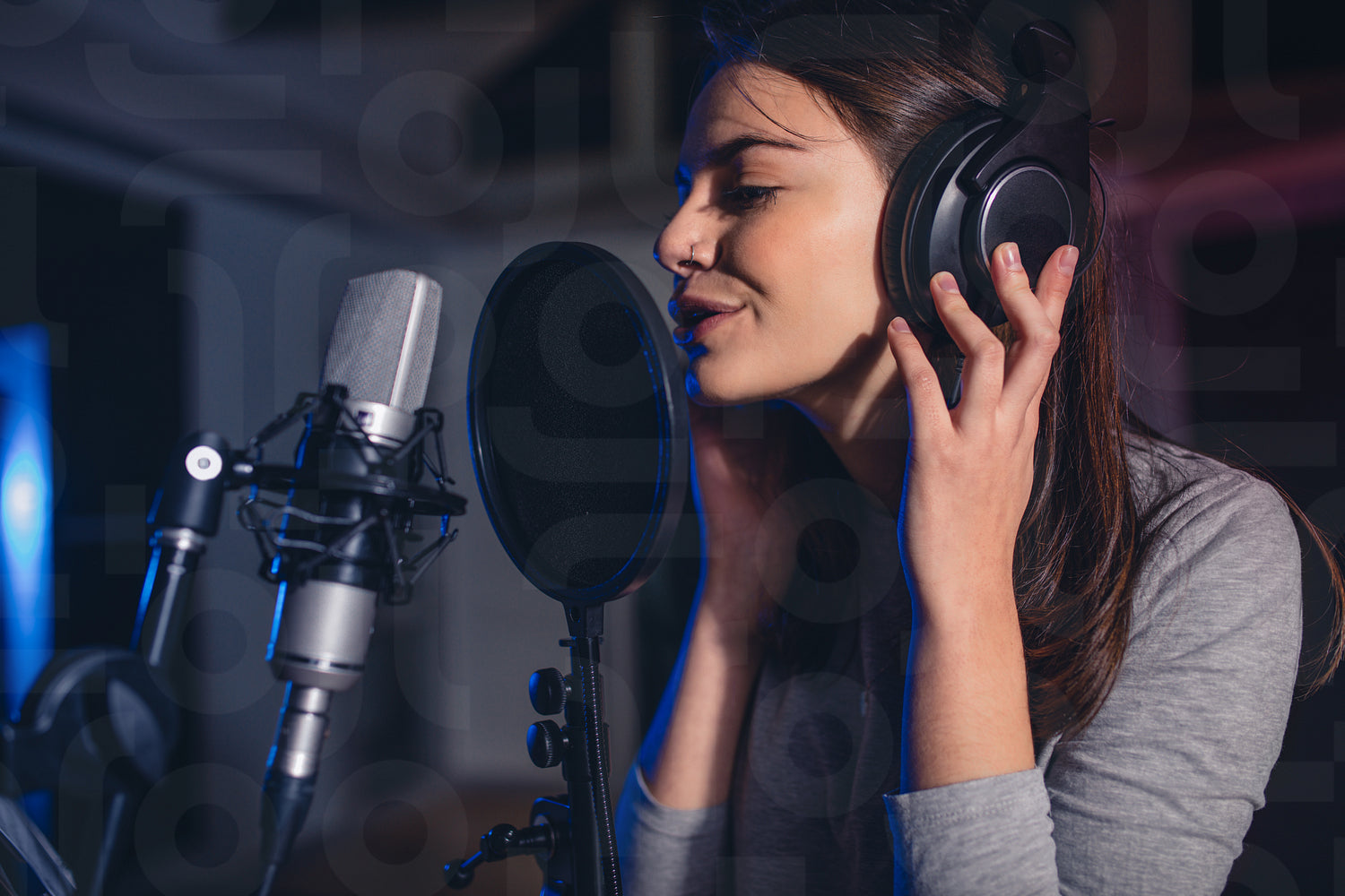 Close up of female vocal artist singing in a recording studio. Woman playback singer singing a song.