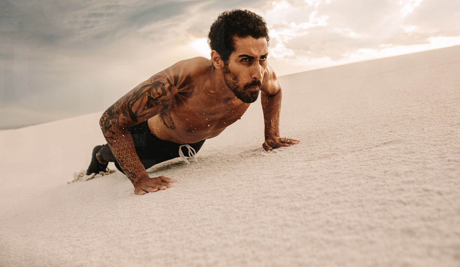 Fit man doing push ups over sand dunes. Muscular man working out on desert sand.