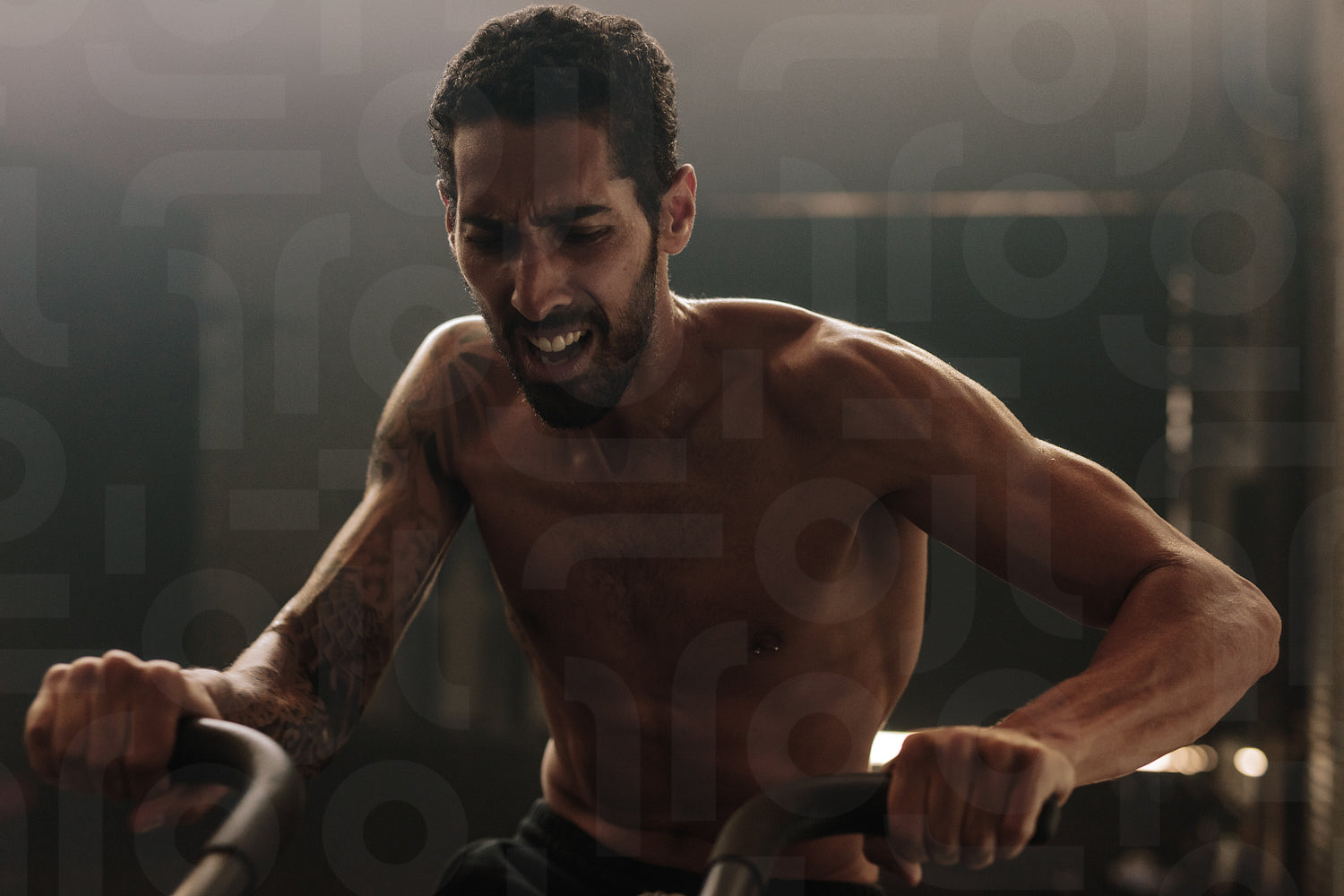 Fit man using exercise bike at the gym. Fitness male using air bike for cardio workout at cross training gym.