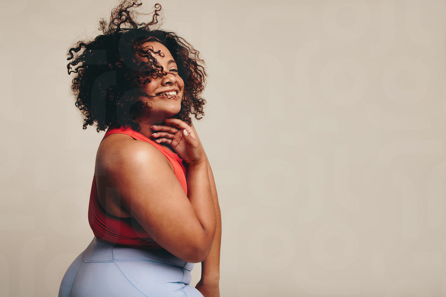Fit woman in sportswear smiling at the camera in a studio. Woman having fun as she embraces her body and curvy physique, expressing self-assurance through dance movement and physical activity.