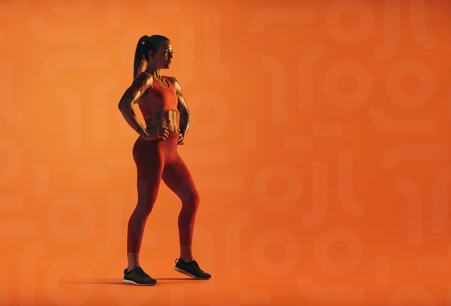 Side view of fit woman doing fitness training on orange background. Female athlete standing with hands on waist doing workout.