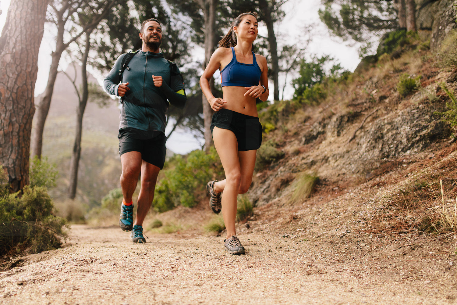 Fit young couple running on mountain trail in morning. Young man and woman jogging on country path.