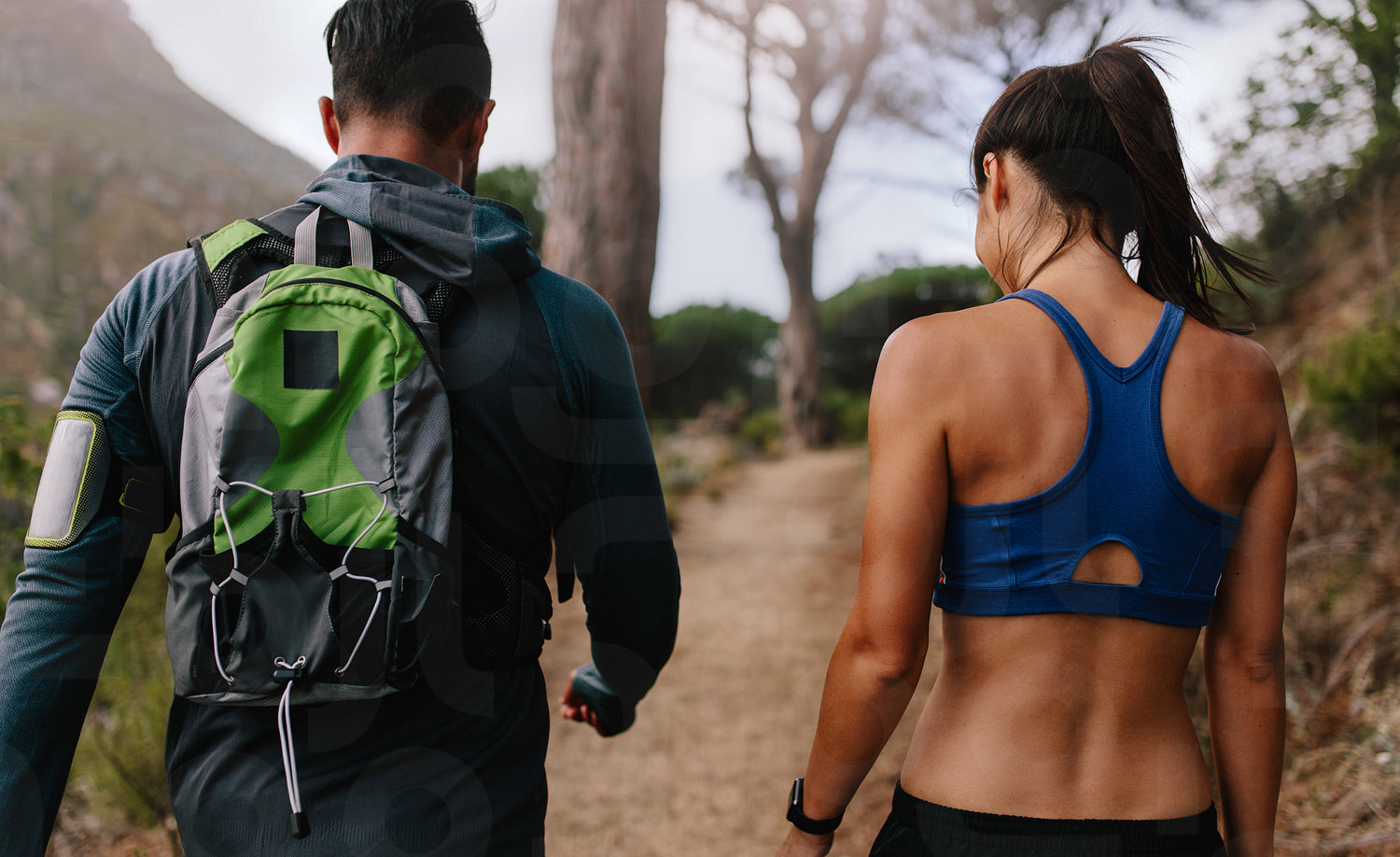 Fit young couple walking on mountain trail