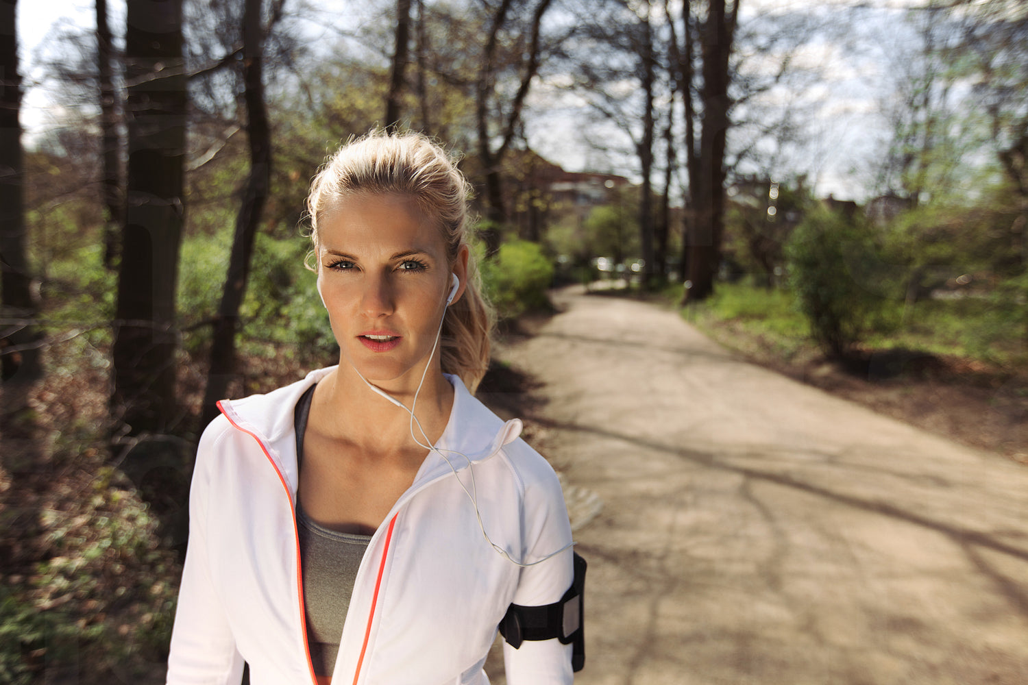 Portrait of pretty young woman in sports clothing wearing earphones while on fitness routine in forest. Young female runner of forest trail.