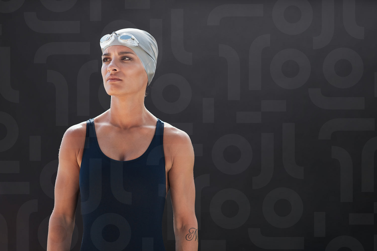 Fit young female swimmer standing and looking away on black background. Shot of a young woman in swimming costume with copy space.