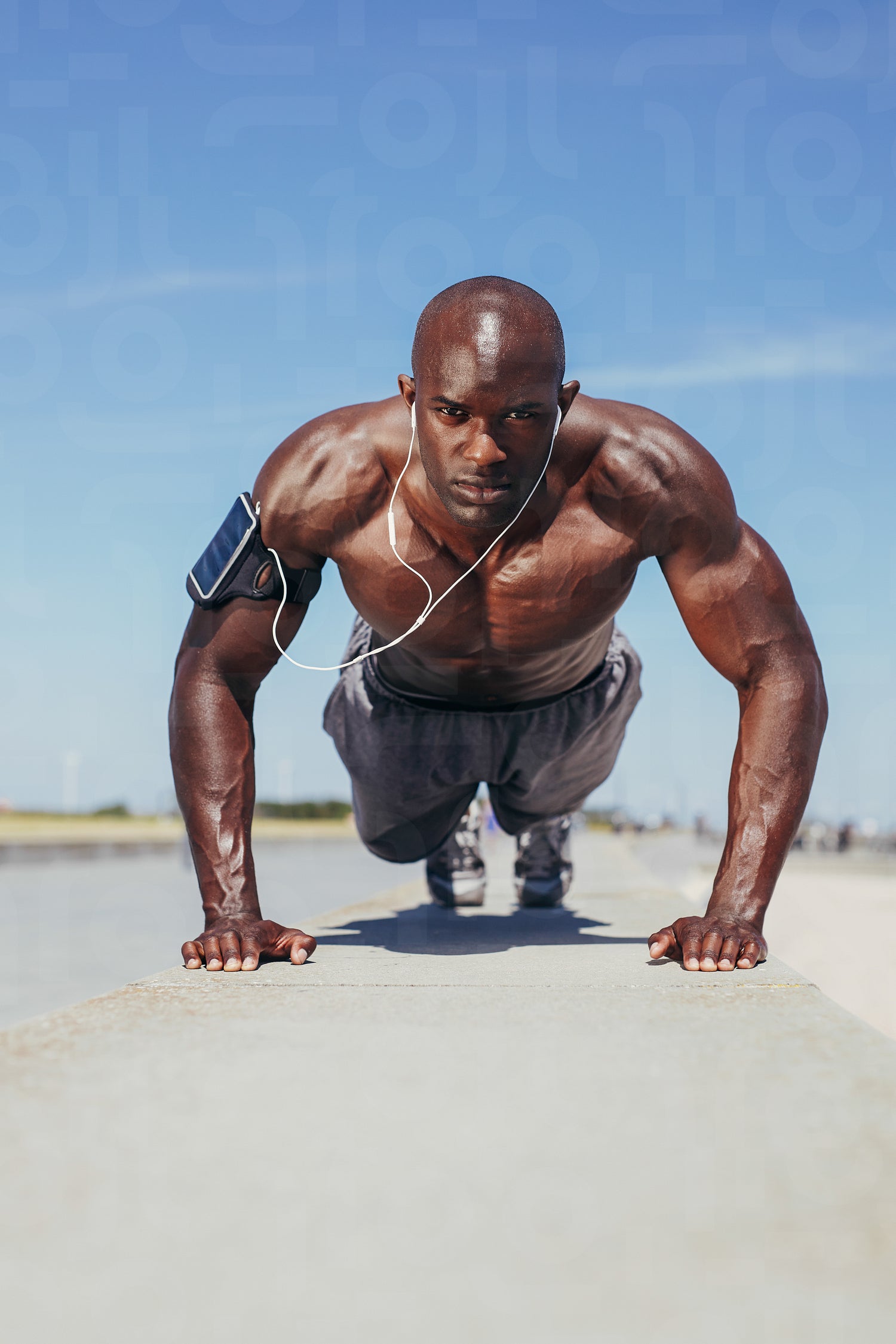 Image of fit young guy doing push-ups. Young fitness model exercising outdoors.