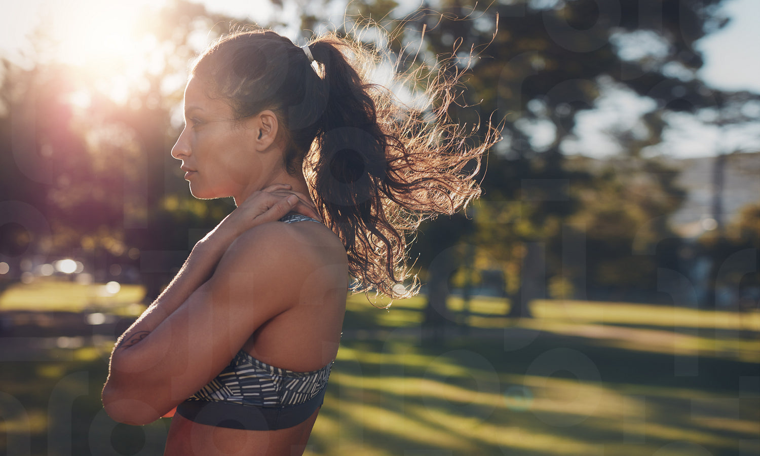 Side view shot of fit young woman standing at a park. Focused young female athlete standing outdoors on sunny day. Copy space right.