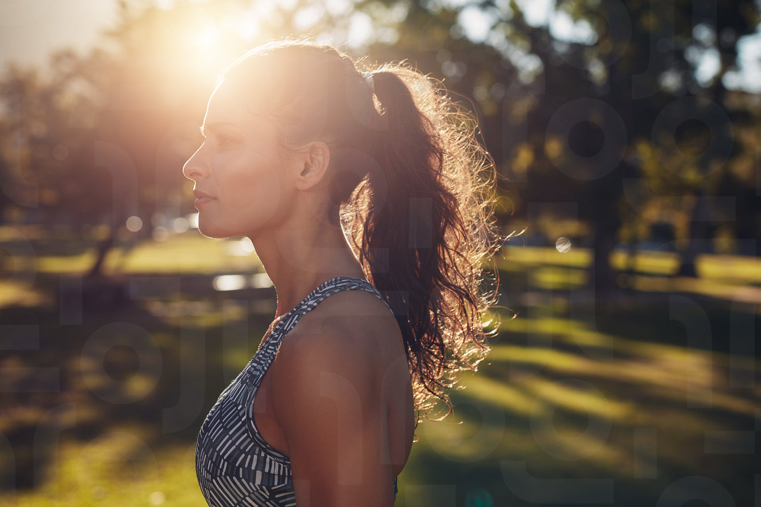 Side view shot of fit young woman in sports bra standing at the park on a sunny day.