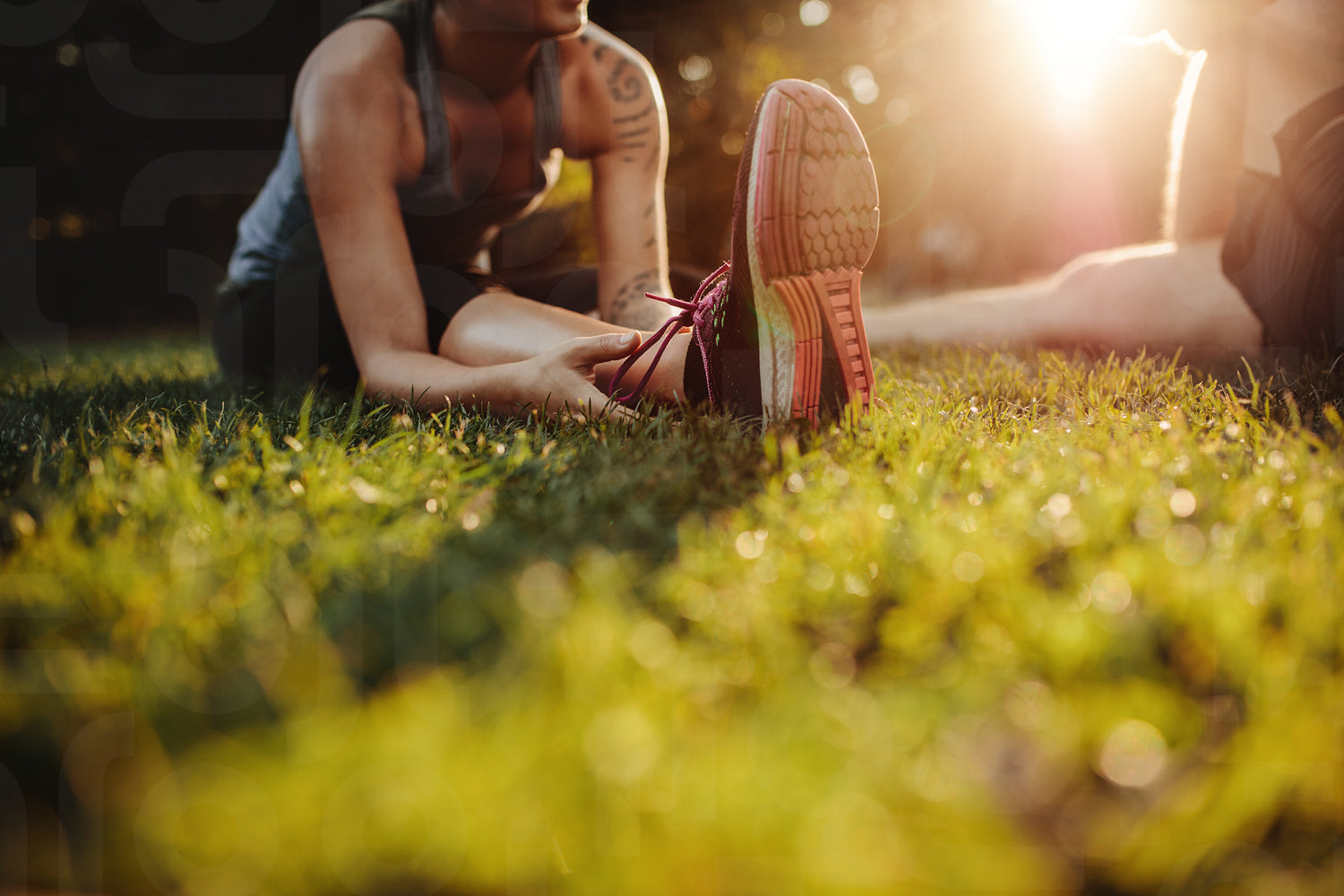 Cropped shot of fit young woman stretching at park with man. Focus on feet of female.