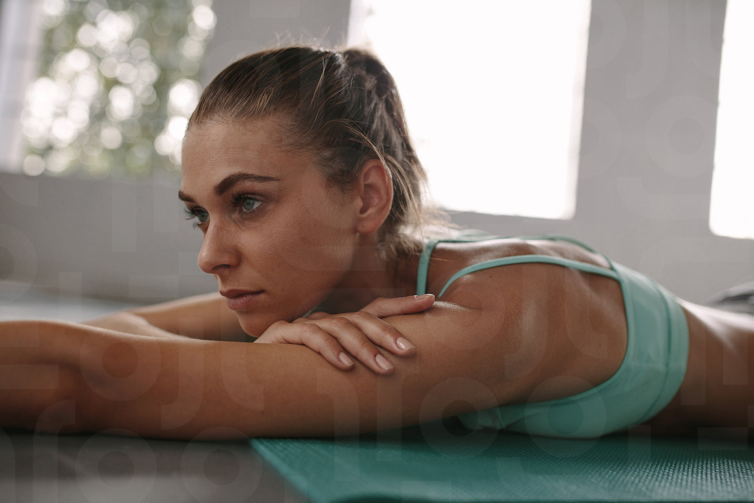 Close up of fit young woman taking rest after workout in health club. Female lying on exercise mat in gym and looking away.