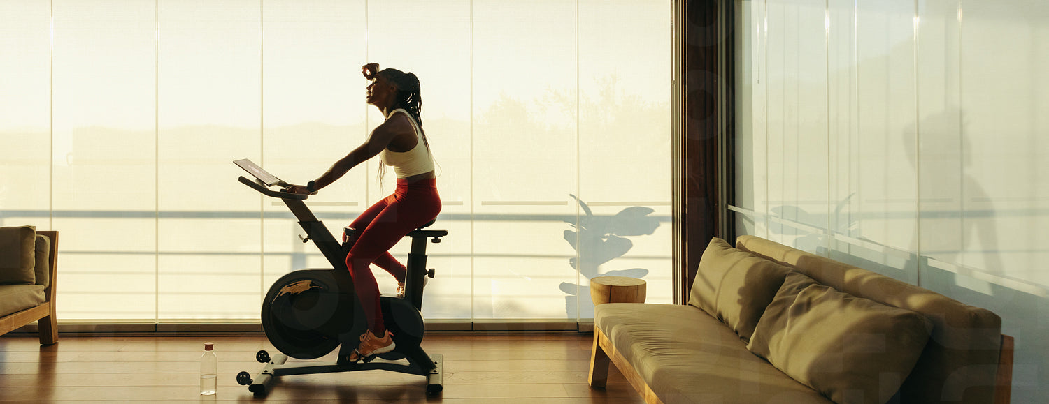 African woman uses a digital exercise bike at home to maintain a healthy lifestyle. Wiping off the sweat on her face, she pedals away on the bike, working towards her fitness and wellbeing goals.