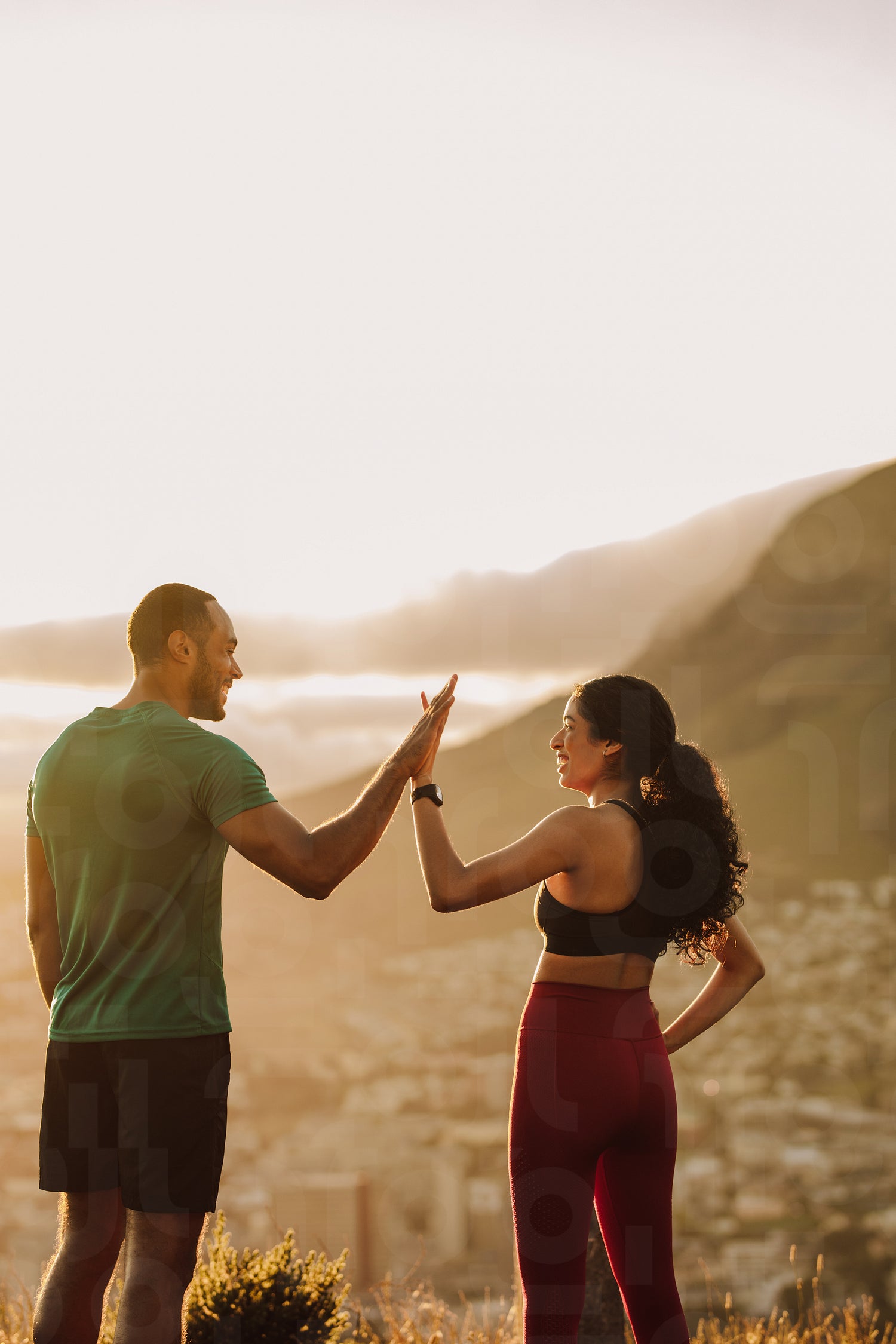 Fitness couple giving a high five after workout standing on a hill. Athletic man and woman celebrate after a run.