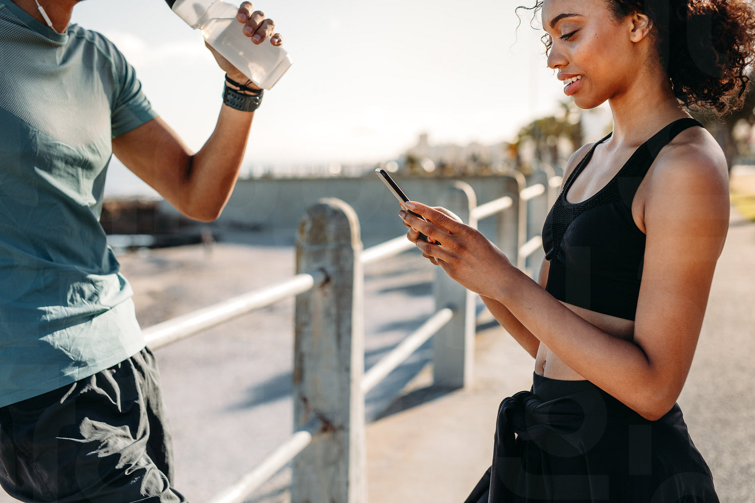 Runner couple standing in street and relaxing. Woman checking her mobile phone during workout while her boyfriend drinks water.