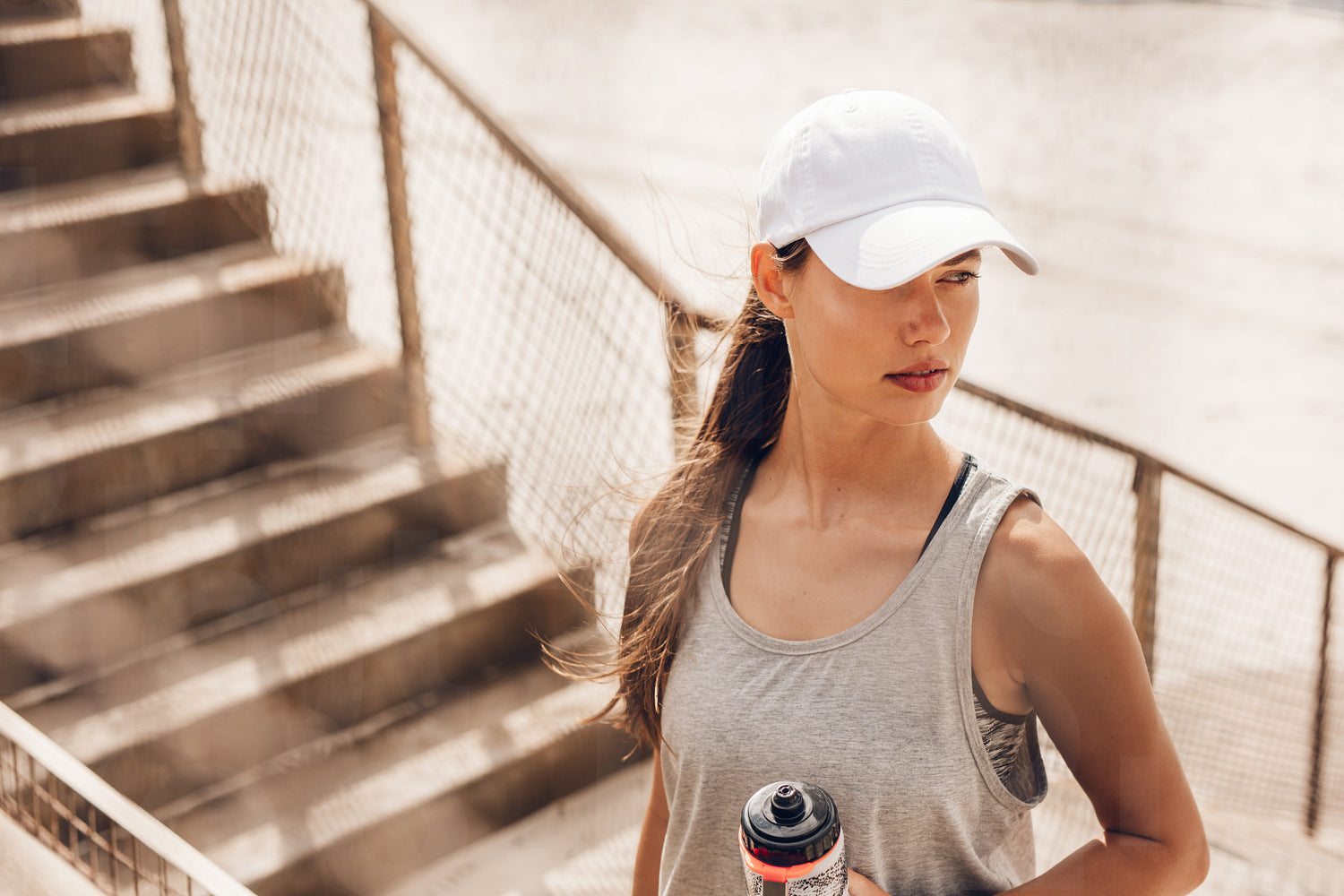 Shot of beautiful young woman in hat standing at the beach holding water bottle and looking away. Fitness female taking a break after workout.