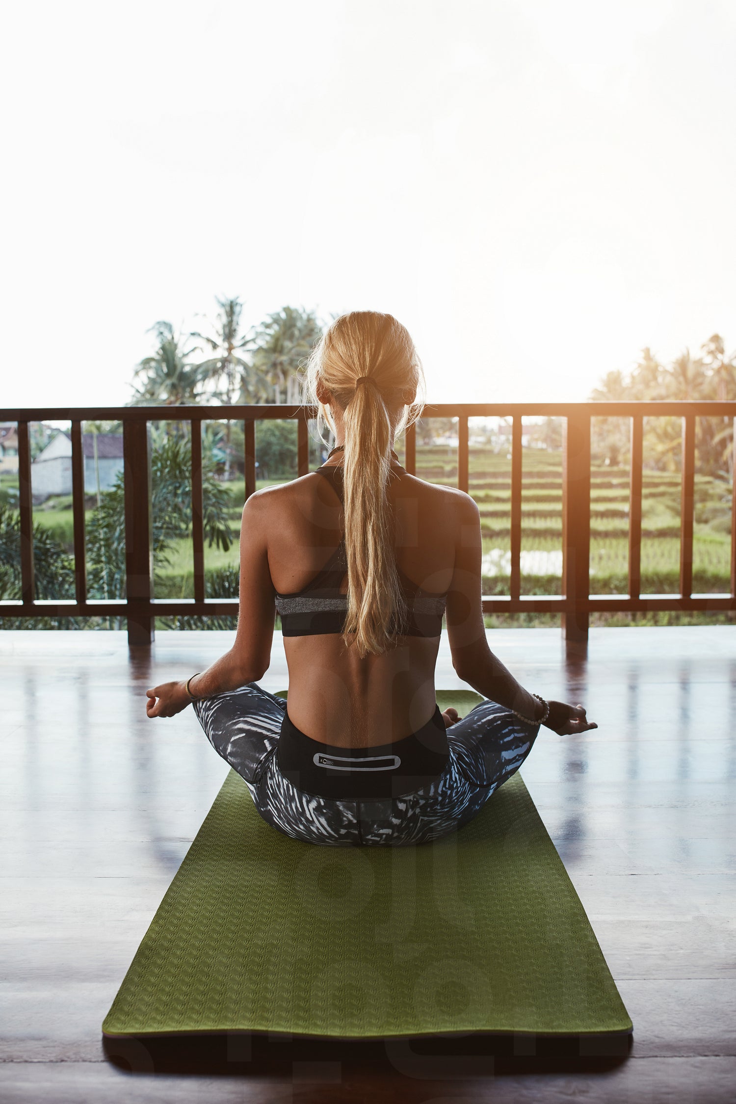 Rear view shot of young woman sitting in lotus yoga pose on exercise mat. Fitness female model doing meditation at health club.