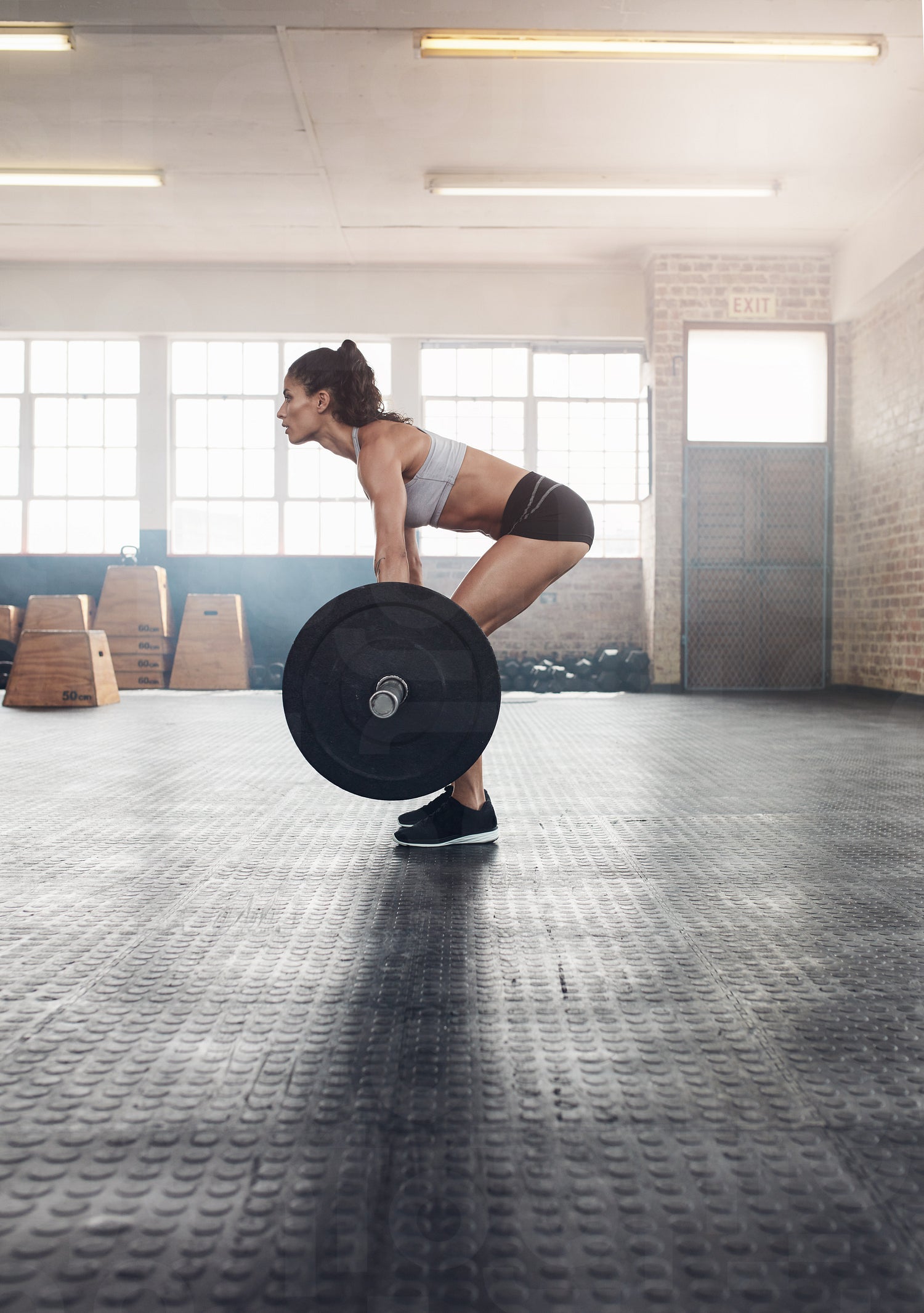 Side view of fitness woman doing exercise with a heavy weights in gym. Muscular woman practicing weightlifting at health club.
