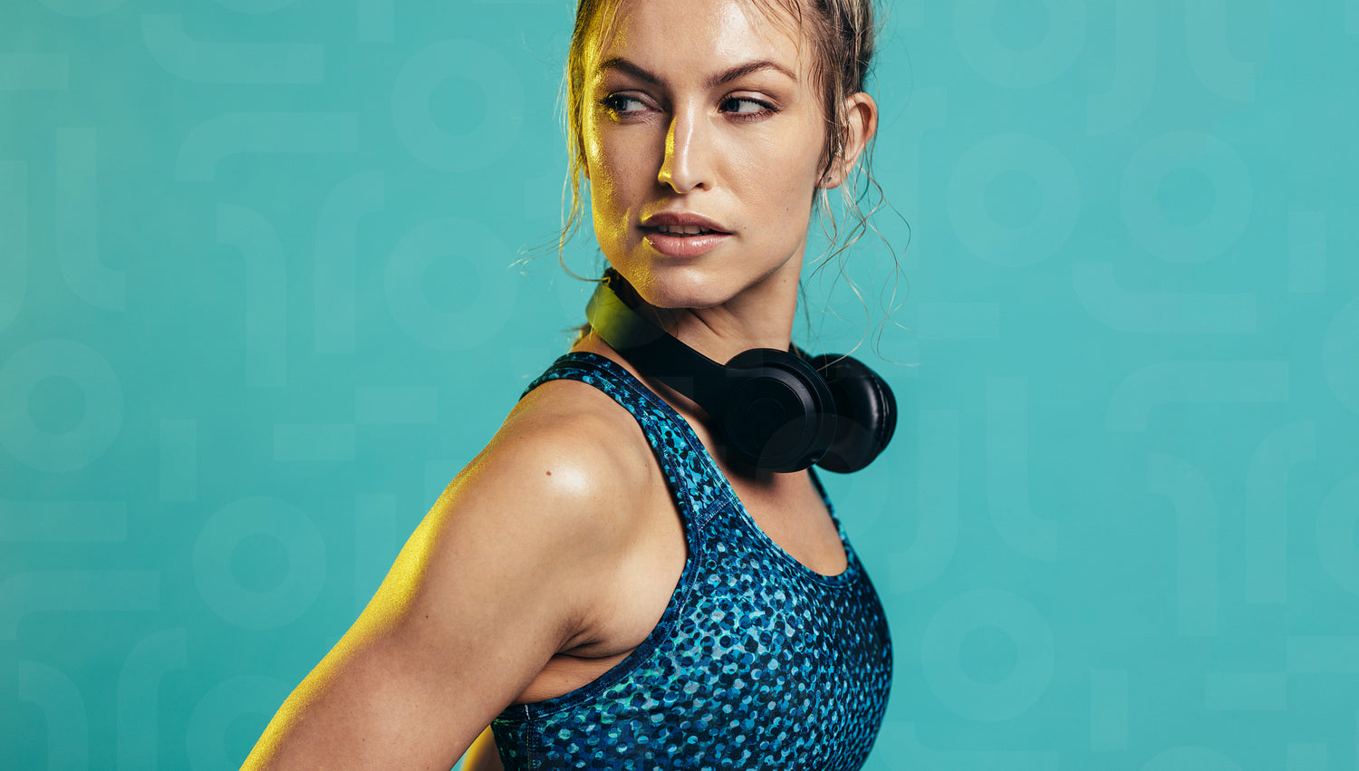 Fitness woman in sportswear and headphones looking over shoulder. Strong sports woman on blue background