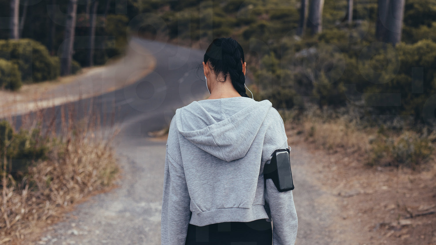 Rear view shot of young woman walking on country trail. Fitness woman in sportswear on cross country path.
