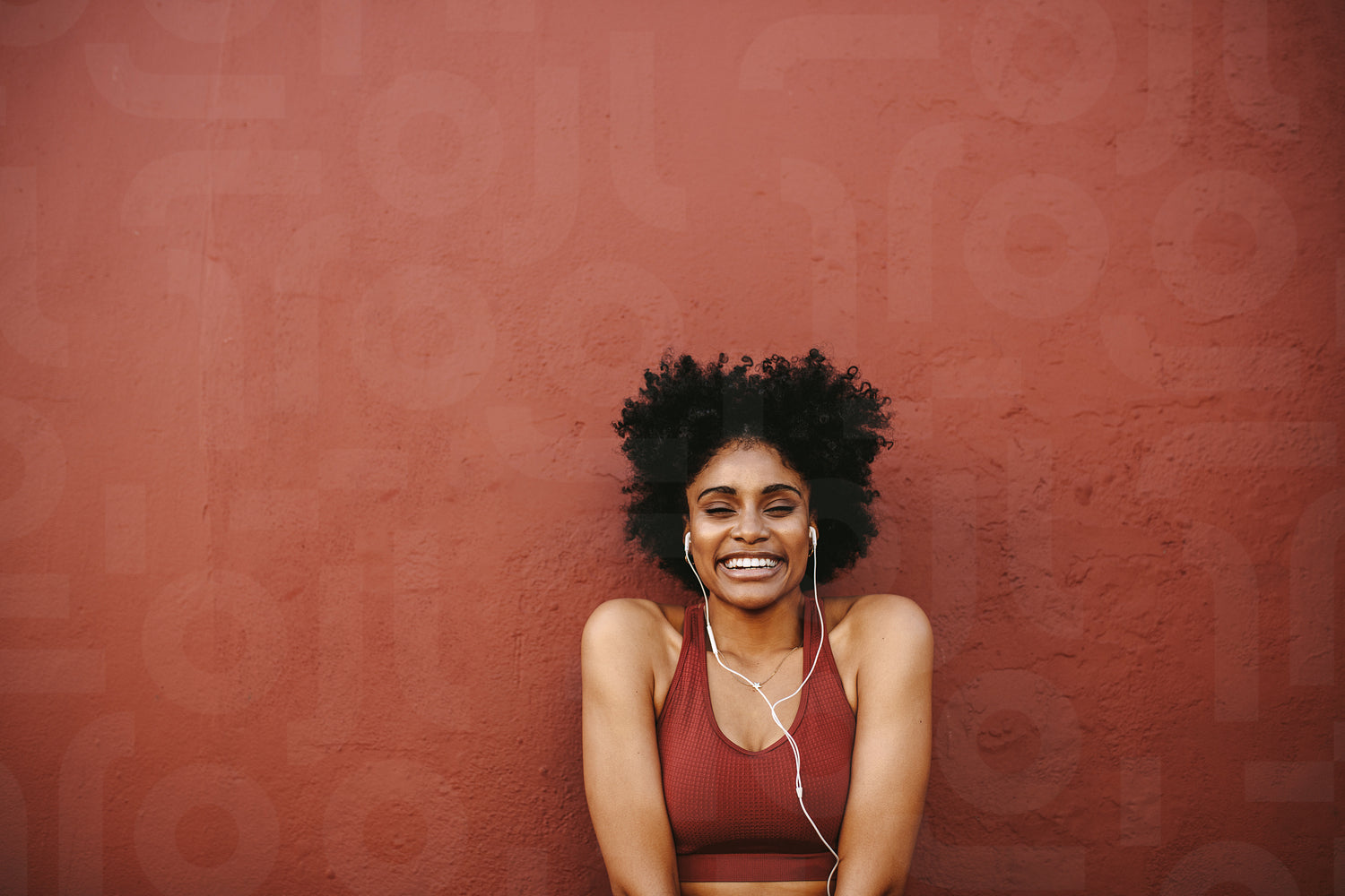 Smiling fitness woman standing against a wall with earphones. Woman in training clothes relaxing after her workout.
