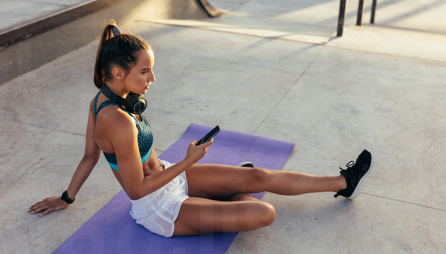 Female sitting on exercise mat with a mobile phone. Fitness woman resting after workout and using mobile phone.