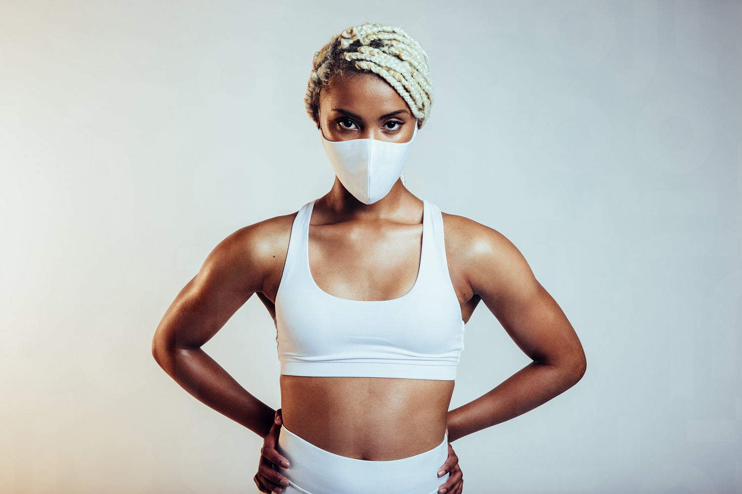 Fit african woman wearing protective face mask. Sportswoman standing with her hands on hips and looking at camera on white background.