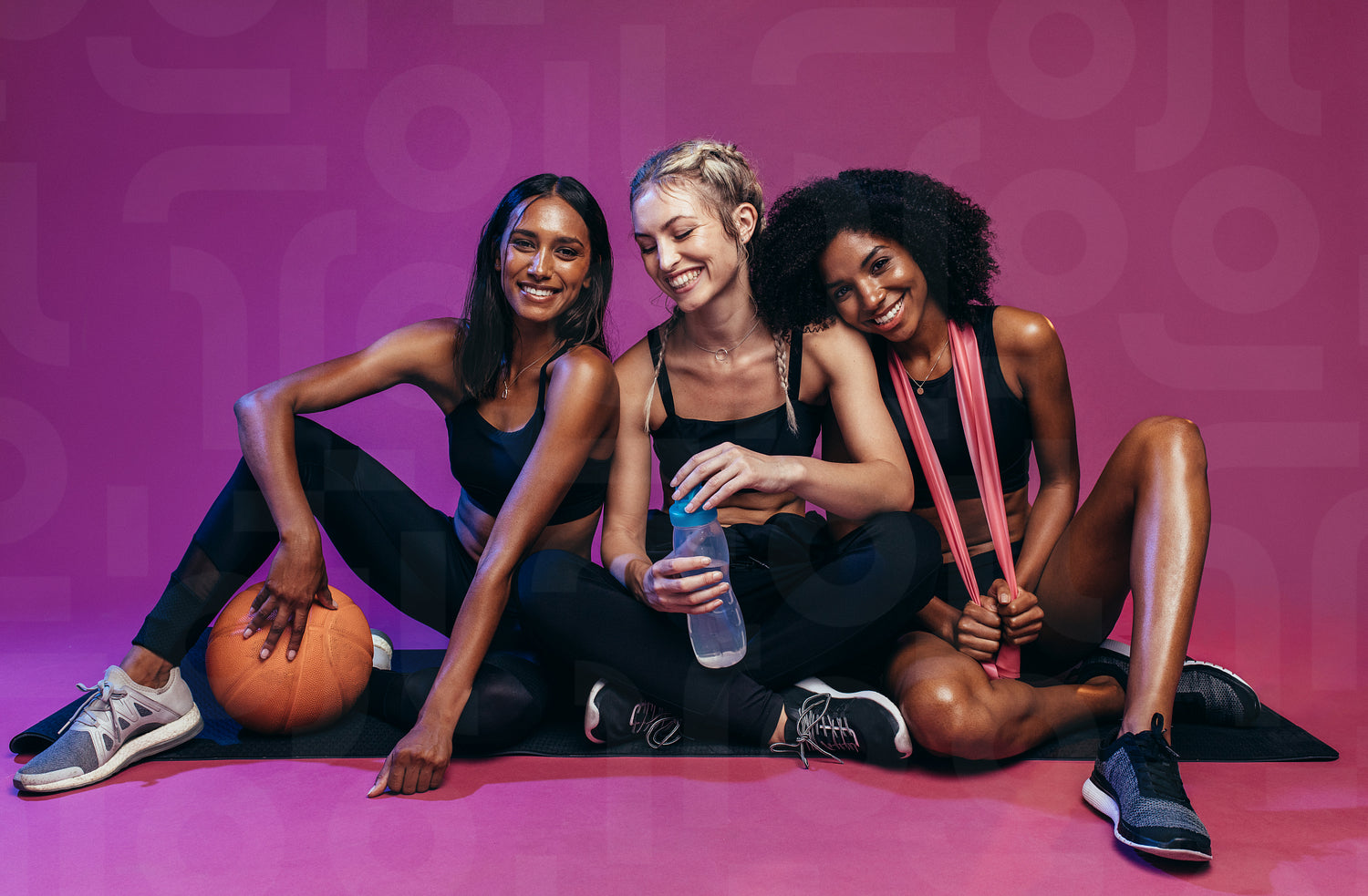 Group of three fitness women resting after workout. Multi-ethnic group of female in sports clothing sitting on colored background with basketball, water bottle and resistance bands.