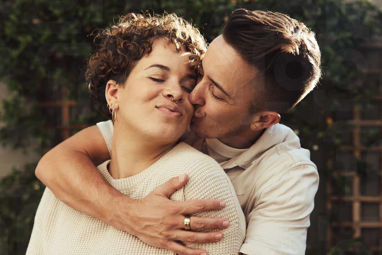Flirty young man kissing his girlfriend outdoors. Romantic young man kissing his girlfriend on the cheek while embracing her from behind. Young LGBTQ+ couple spending quality time together.