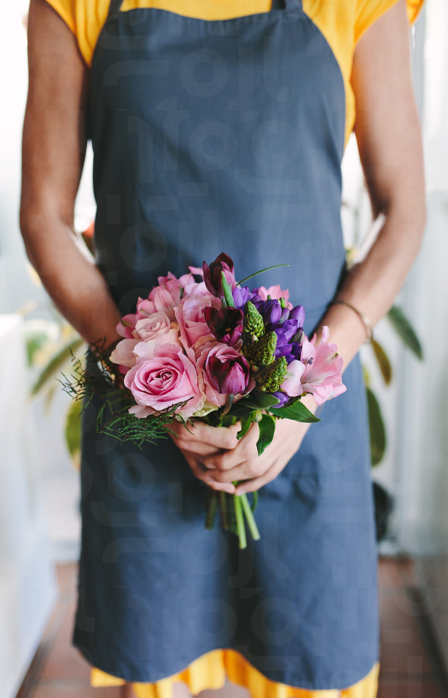 Cropped shot of woman holding mixed flower bouquet in hand. Florist with fresh flowers at flower shop.
