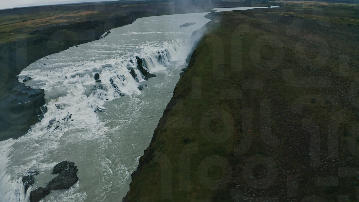 Flying over Gullfoss waterfall. Big waterfall located in the canyon of the Hvita river in Iceland.