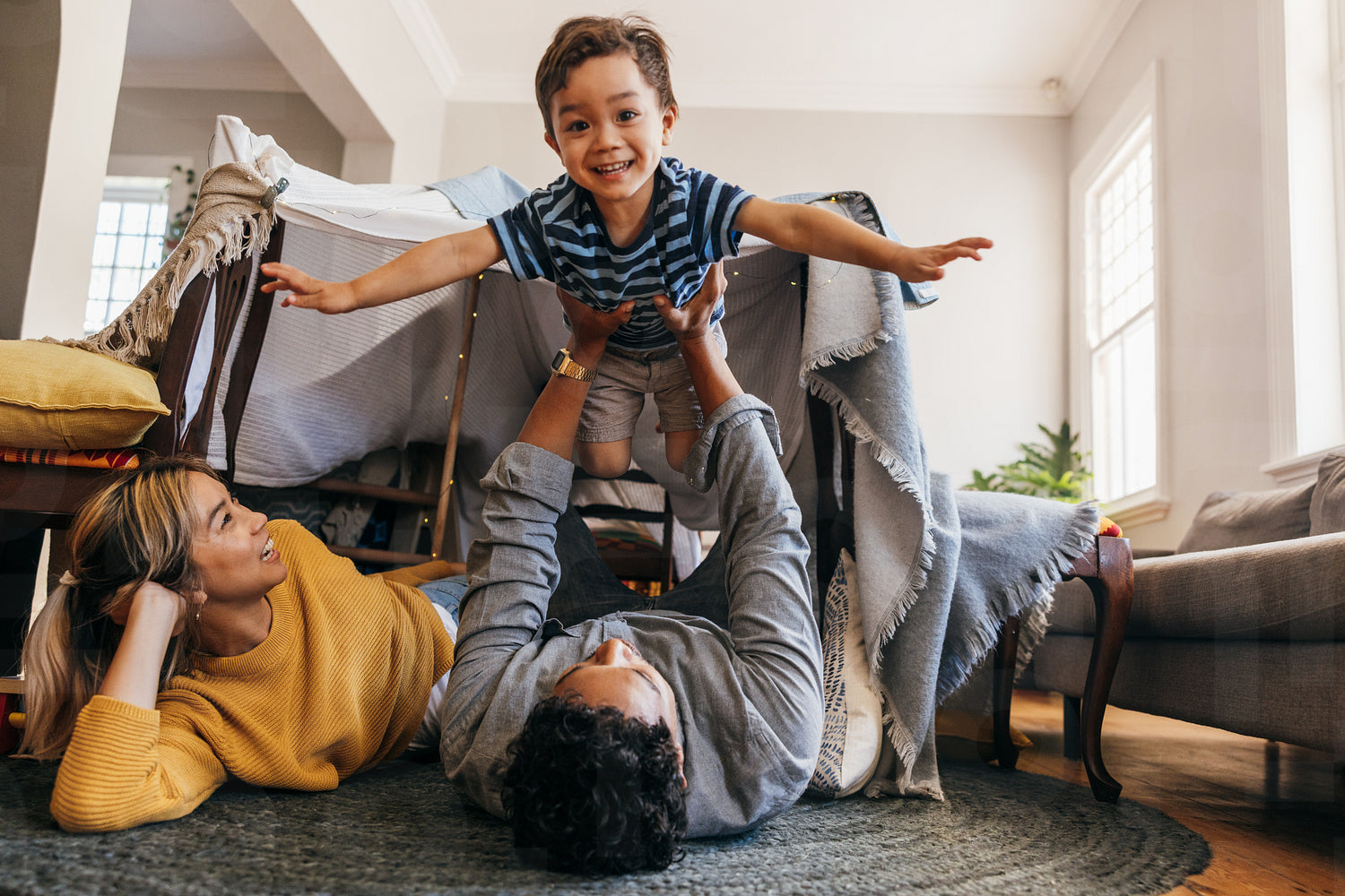 Flying without wings. Happy little boy smiling cheerfully while being lifted by his dad in their play area. Playful family of three spending some quality time together at home.
