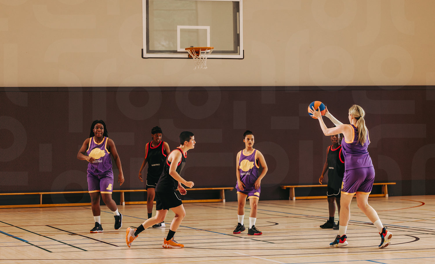 A group of women playing basketball in an indoor gym. The scene captures teamwork and active engagement as they pass and aim. The vibrant environment emphasizes fitness, cooperation, and coordination.