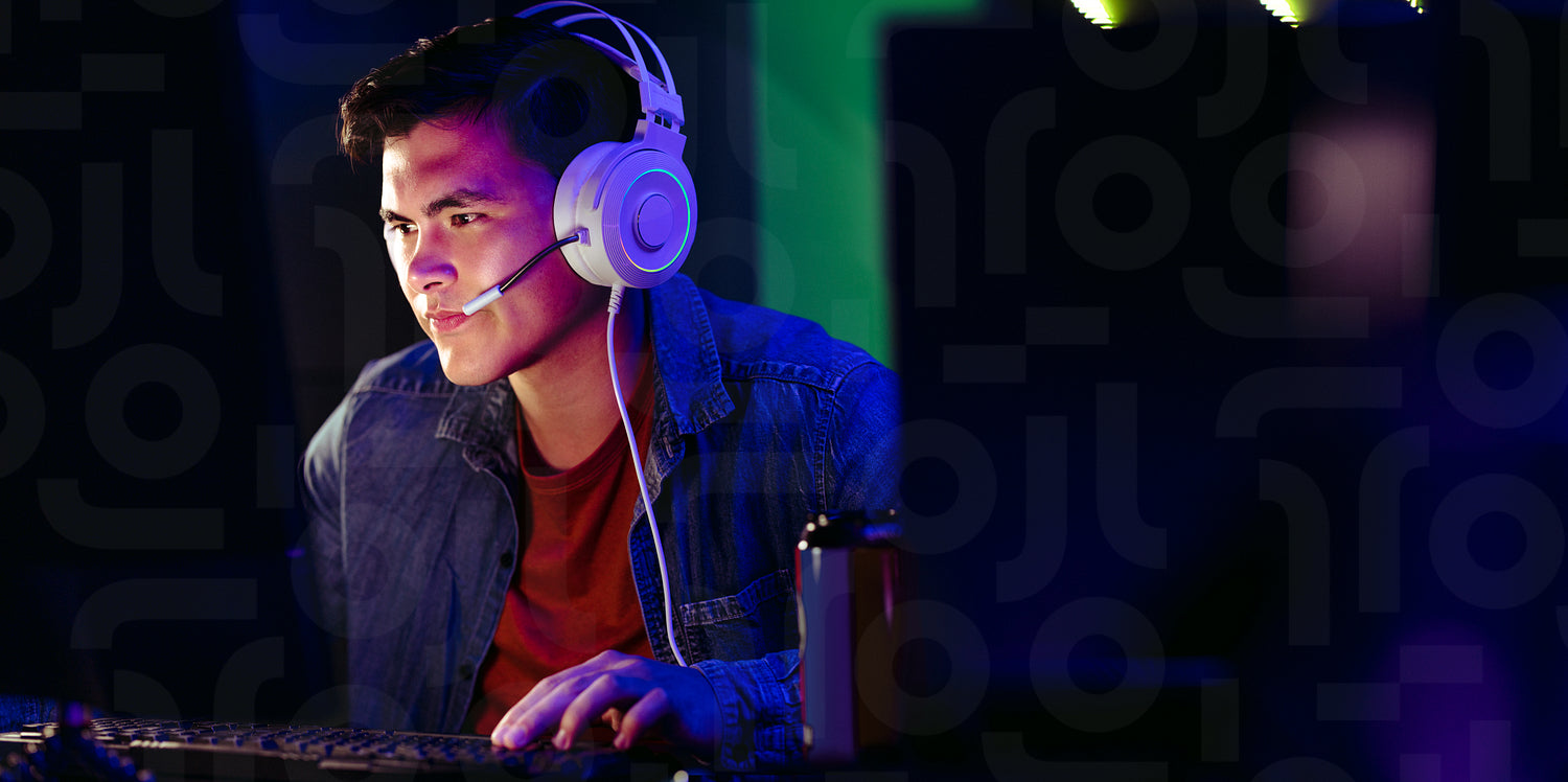 Young male player focusing on his computer screen as he plays a video game with a headset on. Gamer contemplating his next move as he gets into the digital world with a single-player game.