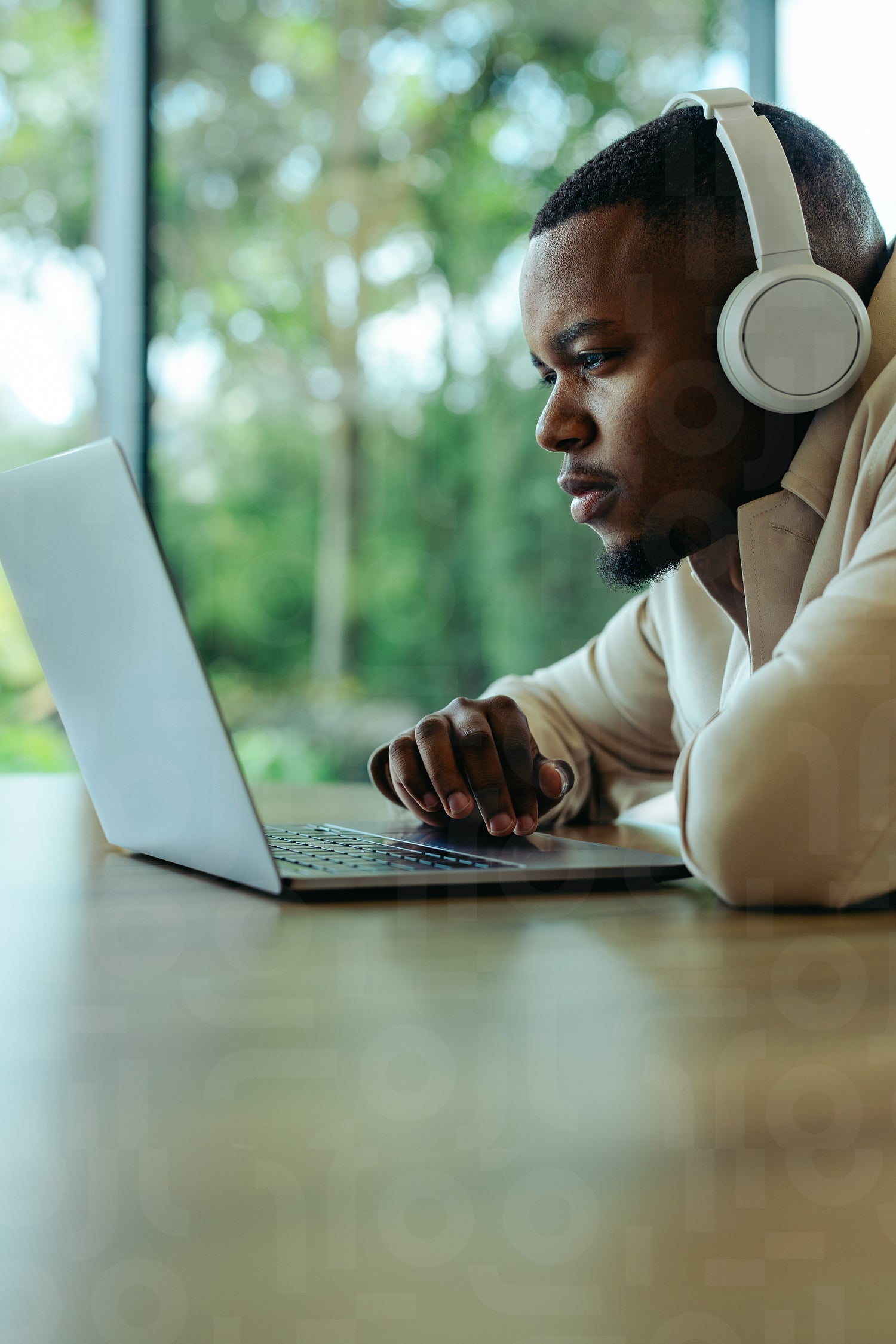 A focused young African man wearing headphones is working on his laptop. He is deeply engaged with the task at hand, conveying a sense of concentration and dedication.