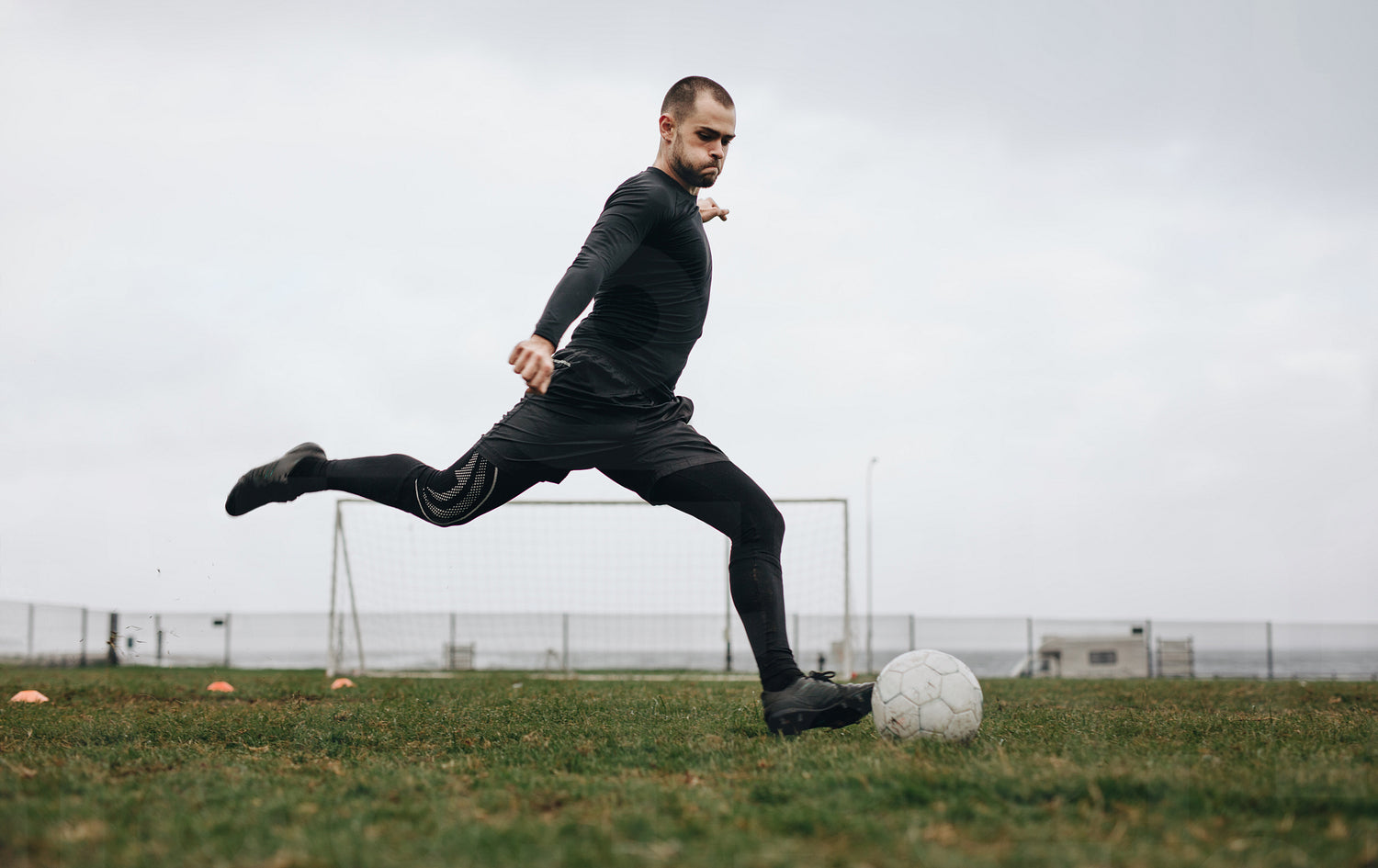 Football player practicing his kicks on the field on a cloudy day. Man playing soccer on field about to kick the ball.
