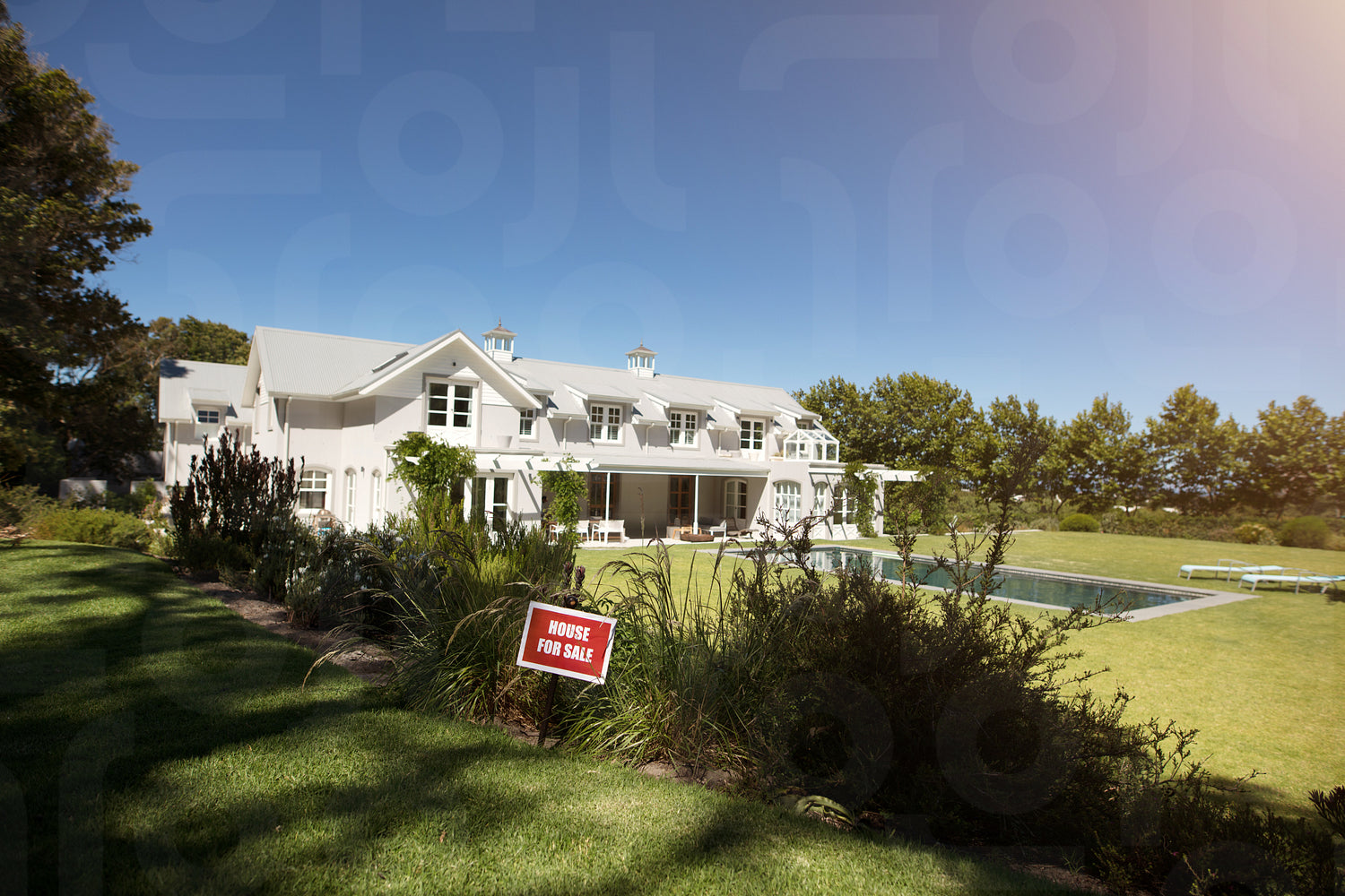 Luxury house for sale with nicely designed front yard. For sale sign in front of the house by real estate agency.