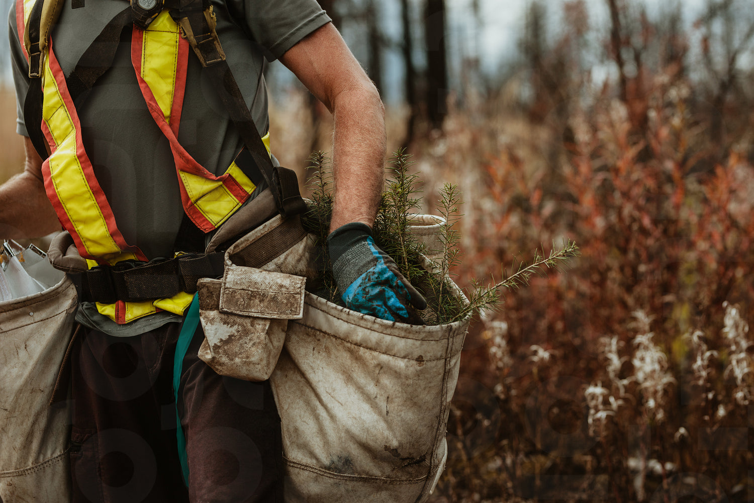 Cropped shot of forester taking out small trees from his bag for planting. Man in reflective vest carrying bags full of saplings in forest.