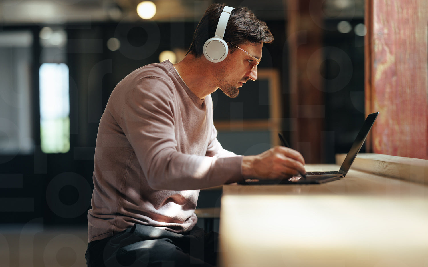 Freelance web designer working with a graphics tablet and a laptop. Male design professional working on a project in a coworking office. Creative business man working remotely.