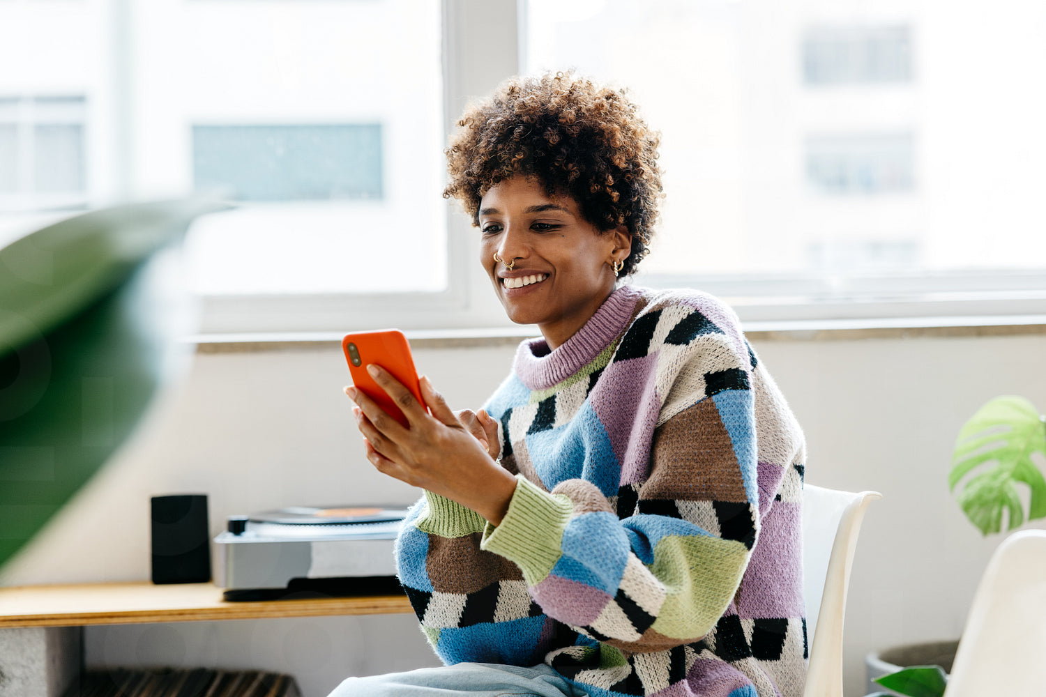 A young female freelancer in a vivid patterned sweater focused on her smartphone while working in a bright co-working office space, conveying a sense of creativity and productivity in a casual work environment.