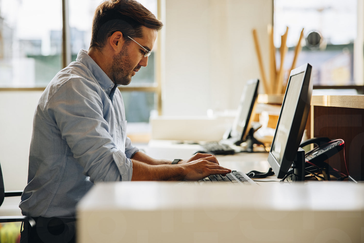 Freelancer typing on computer keyboard in office. Young man sitting at desk working on computer.