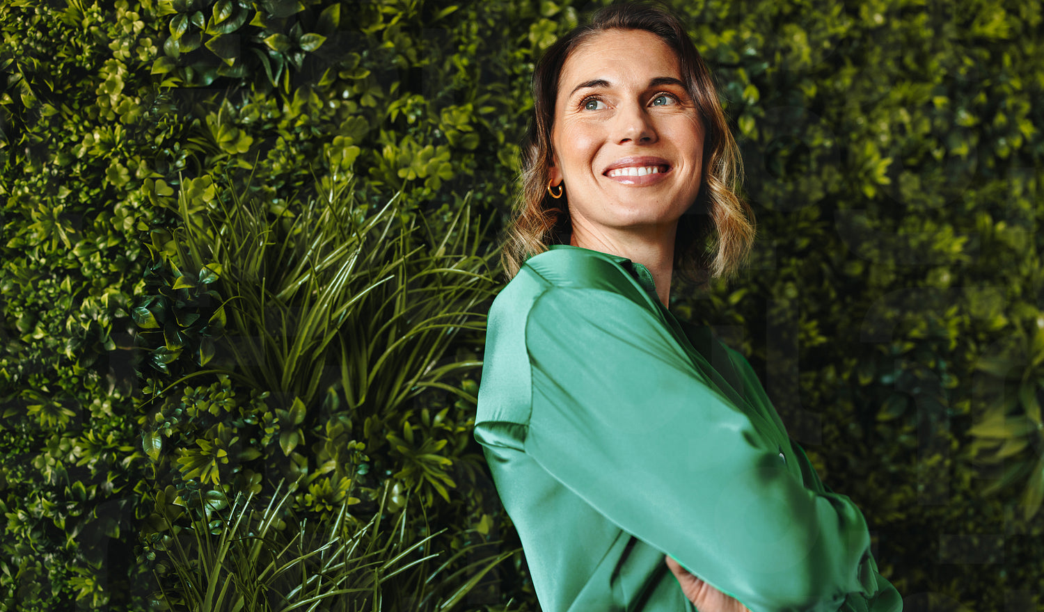 Freelancing with sustainability: Woman standing in a green coworking office