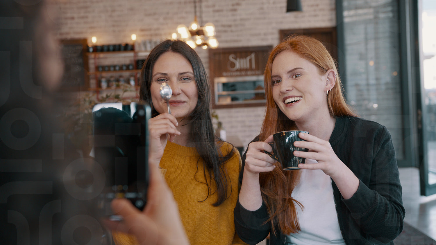 Group of female friends at a cafe taking pictures with mobile phone. Woman talking picture of her friends drinking coffee in the restaurant.