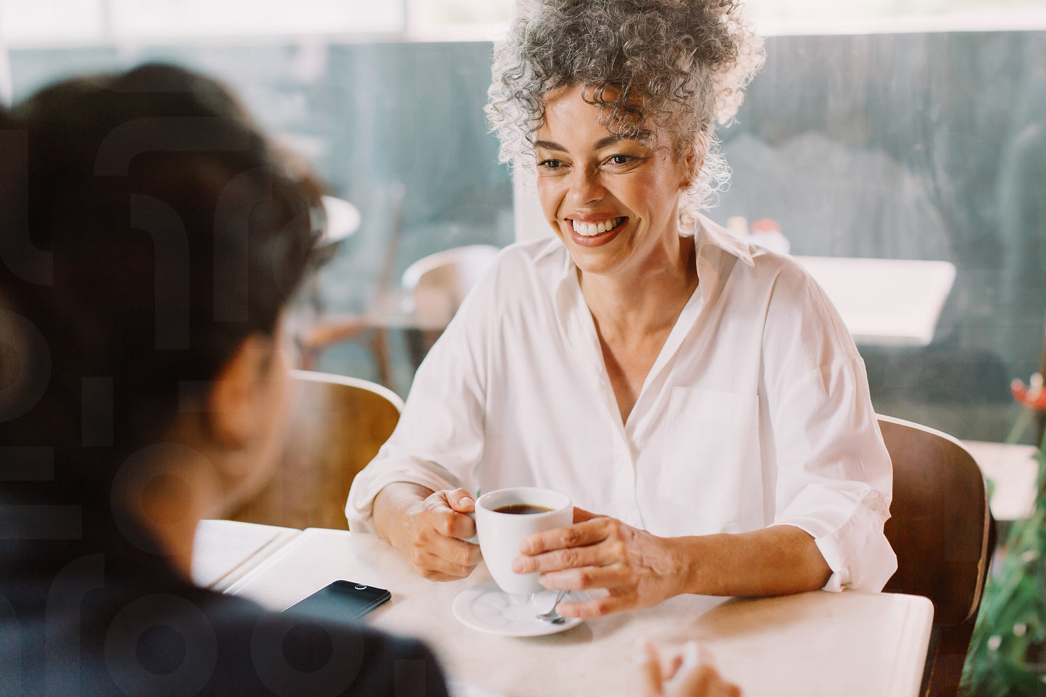 Two women sitting at a coffeeshop catching up over a cup of coffee. Friends talking at a cafe while sitting at a table drinking a hot drink.